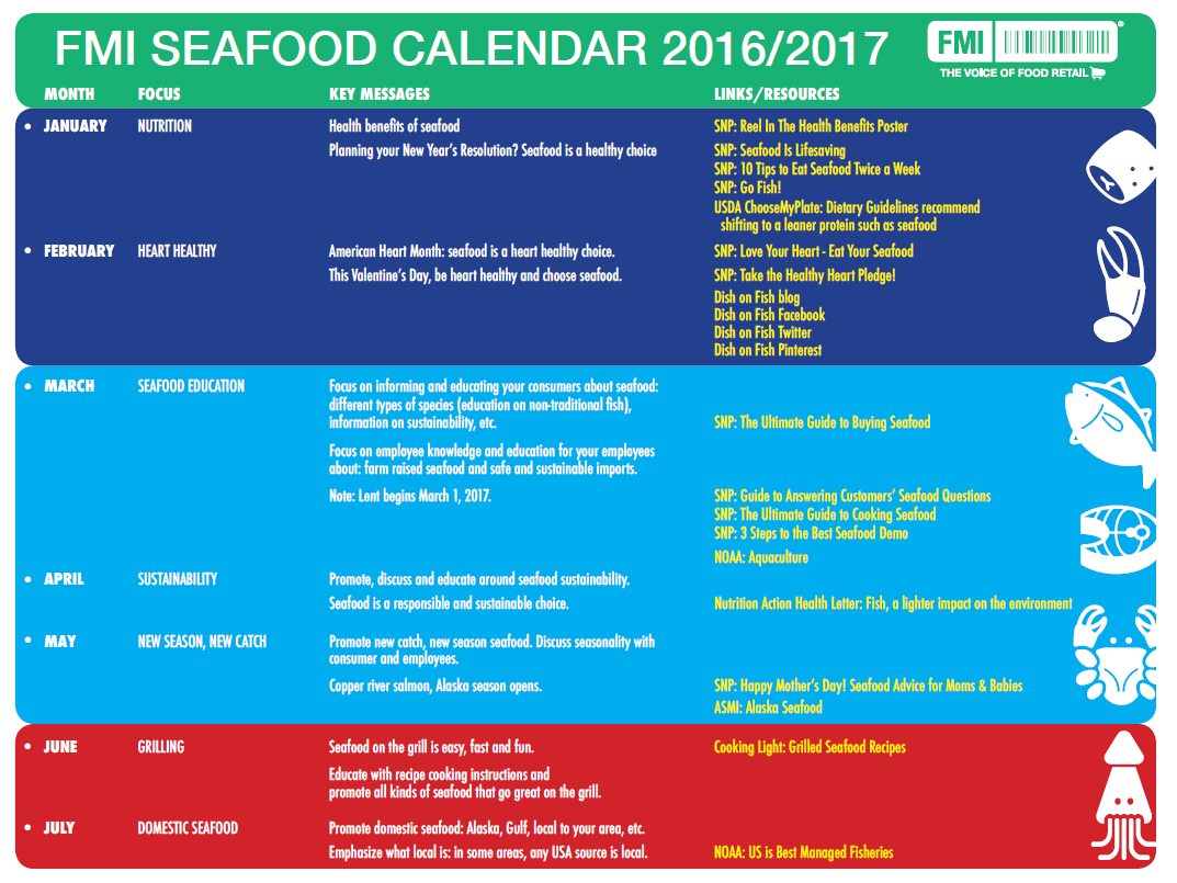 Food retailers are invited to use this original calendar, available online on the FMI Seafood webpage, aimed at promoting seafood consumption and knowledge among grocery associates and their customers. The calendar offers monthly themes to serve as the base for marketing and internal communications plans. We've included key messages and useful resources to help you plan your promotional campaigns. We’re also working to collaborate with seafood industry groups to help publicize the calendar in conjunction with their consumer-facing programs as food retailer resources. For example, the National Fisheries Institute just developed a program backed by dietitians and nutritionists called Dish on Fish, which helps to promote seafood consumption with healthful recipes.