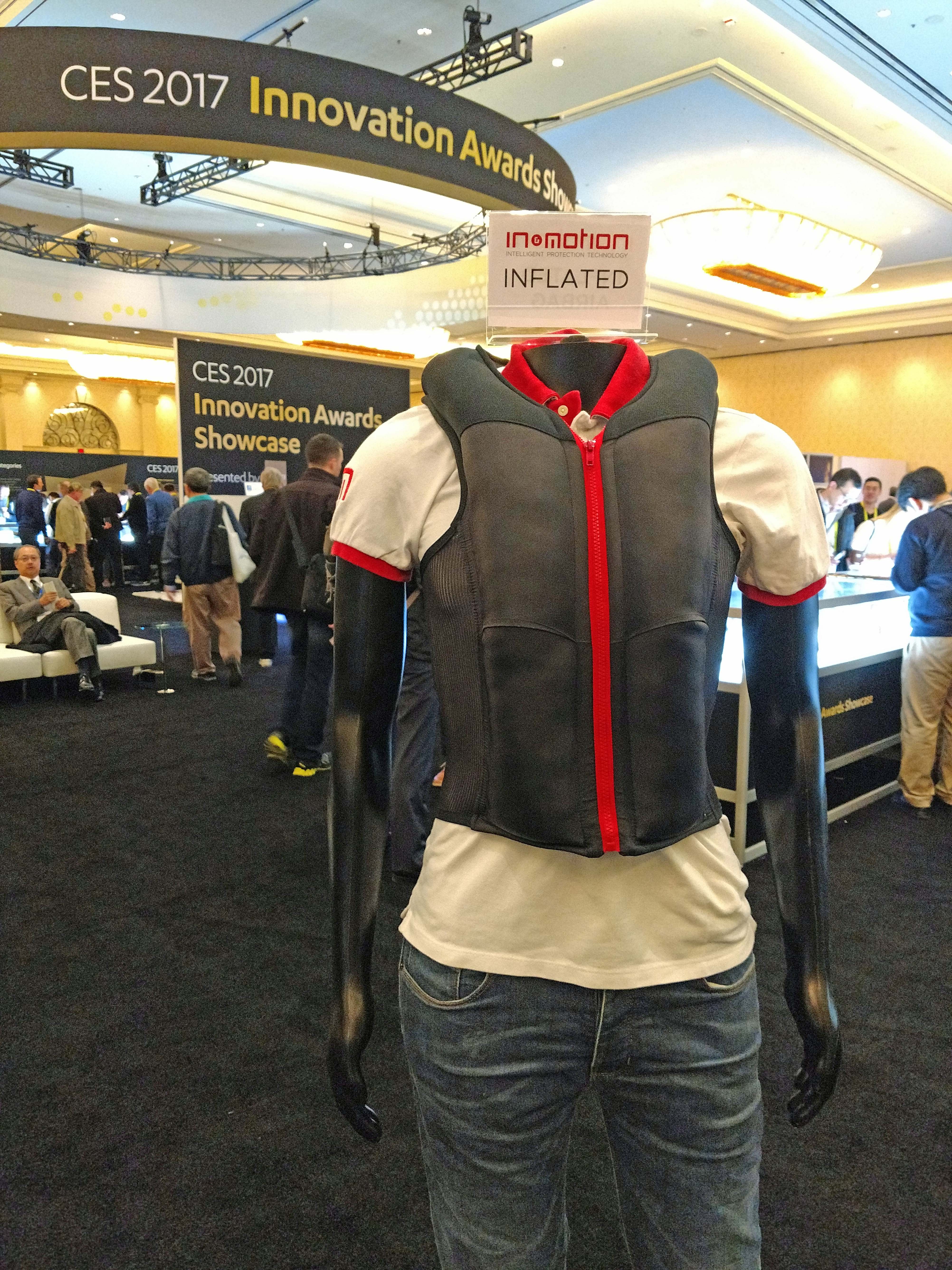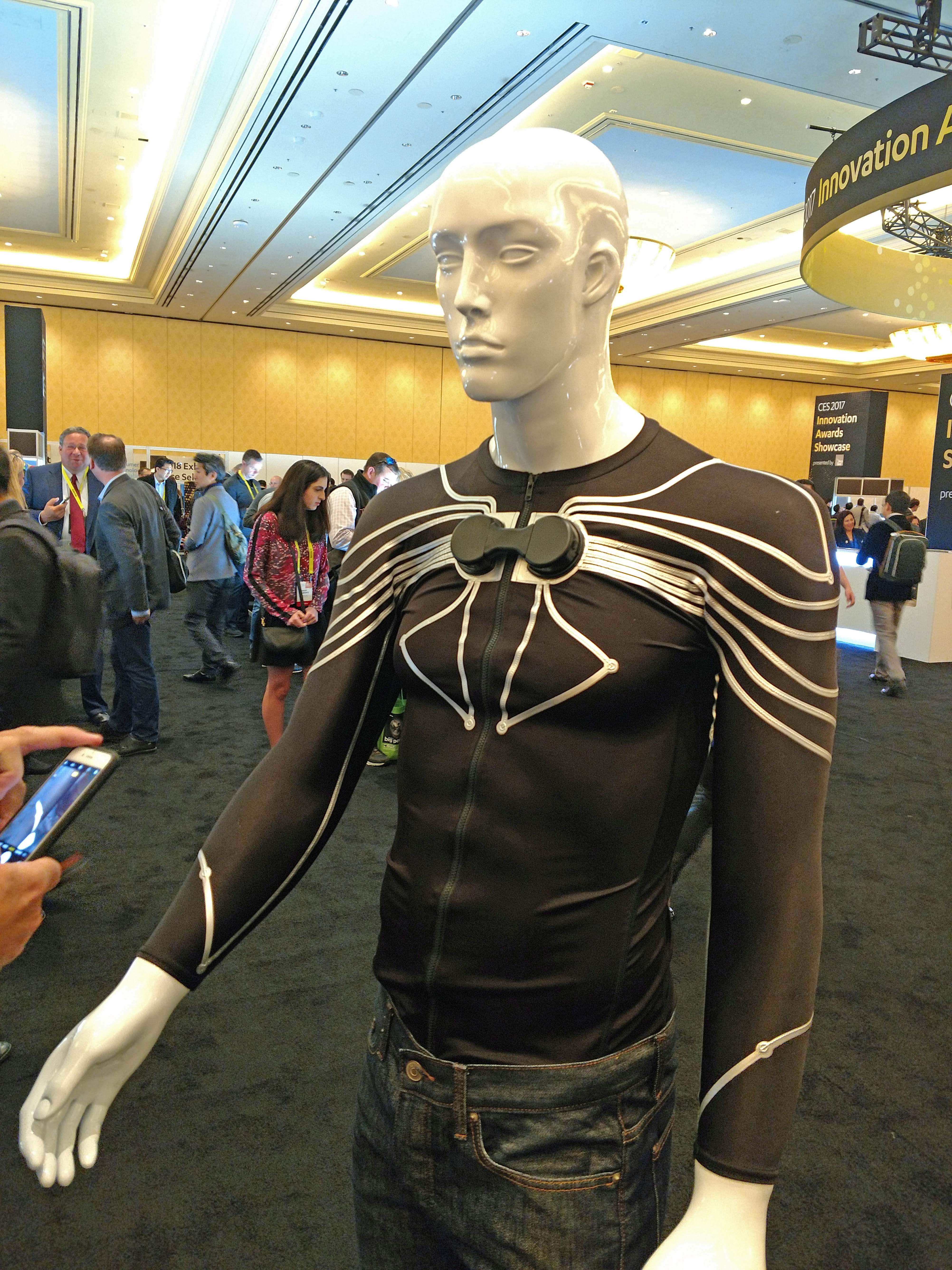 the health and wellness market. Xenoma's "e-skin" is a black zip-up jacket that monitors your breathing, motion, body temperature and posture. Yes, posture! Looking for some extra protection when you’re on your bicycle? Check out this airbag vest that inflates on impact to give you extra bounce and more collarbone protection.